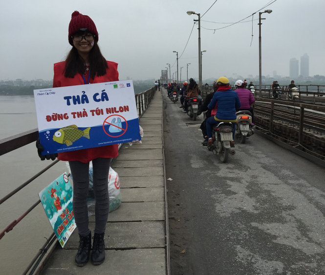 Đây là thông điệp gửi tới người dân Hà Nội trong dịp Tết ông Công ông Táo của 40 tình nguyện viên thuộc “Nhóm Cá chép” được ghi trên những tấm biển do các bạn cầm trên tay dọc cầu Long Biên và hai đầu cầu Chương Dương.