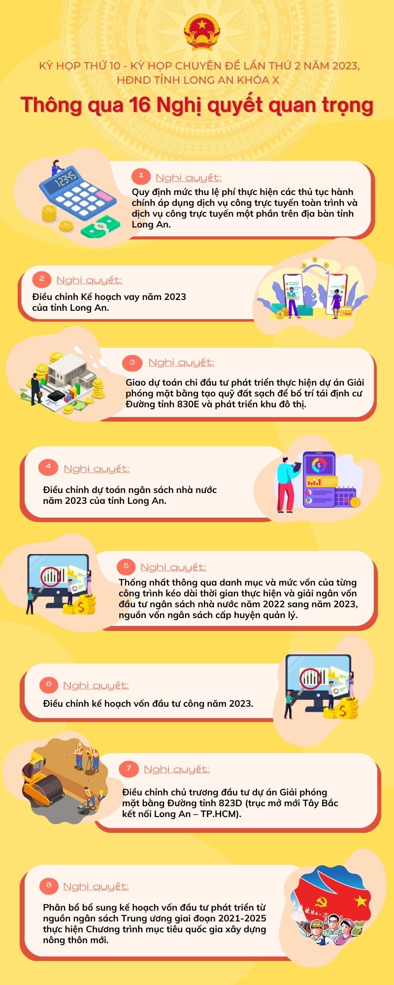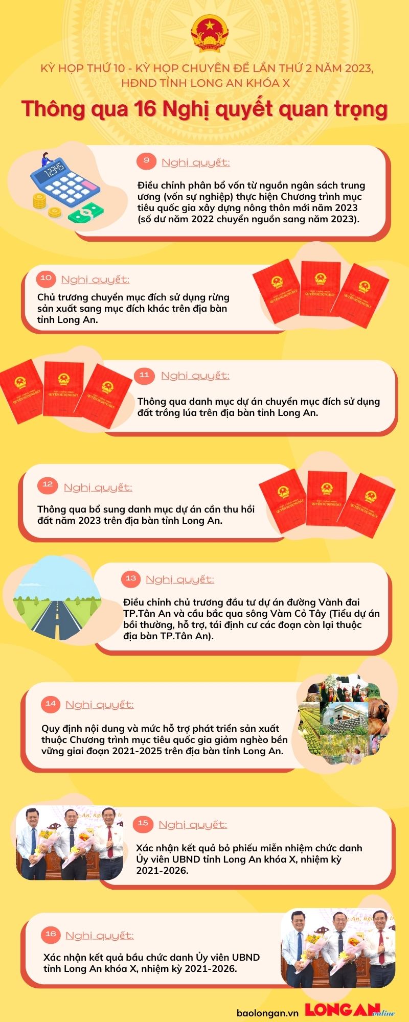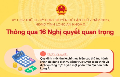 Ngày 30/5/2023, tại Kỳ họp chuyên đề HĐND tỉnh Long An khóa X, các đại biểu thống nhất thông qua 16 Nghị quyết quan trọng, gồm 14 Nghị quyết về KT-XH và 2 Nghị quyết về công tác nhân sự.