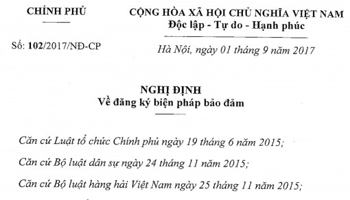 Nghị định số 102/2017/NĐ-CP về đăng ký biện pháp bảo đảm được Chính phủ ban hành ngày 01/09/2017, có hiệu lực từ ngày 15/10/2017.
