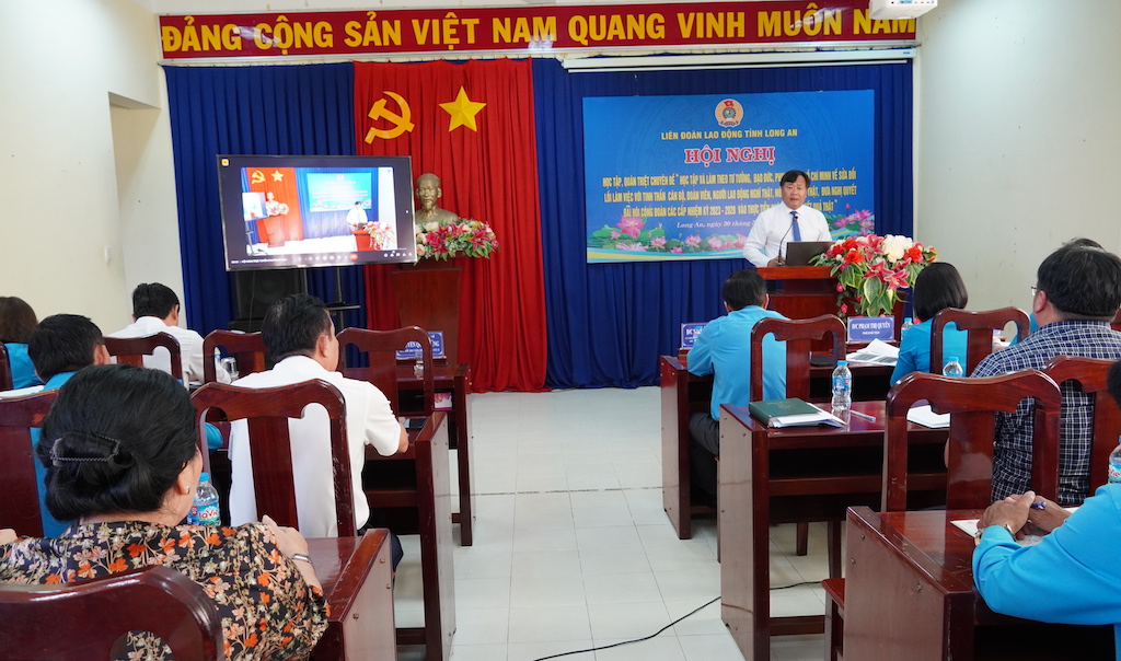 Liên đoàn Lao động (LĐLĐ) tỉnh Long An tổ chức Hội nghị trực tuyến học tập, quán triệt Chuyên đề “Học tập và làm theo tư tưởng, đạo đức, phong cách Hồ Chí Minh về sửa đổi lối làm việc với tinh thần cán bộ, đoàn viên, người lao động nghĩ thật, nói thật, làm thật, đưa nghị quyết Đại hội Công đoàn (CĐ) các cấp nhiệm kỳ 2023 - 2028 vào thực tiễn cuộc sống có kết quả thật”.