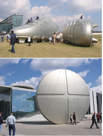 Tác phẩm Der moderne Fußballschuh (Giày bóng đá hiện đại) bao gồm 2 chiếc giày làm bằng nhựa (trên) và tác phẩm Meilensteine der Medizin (Những cột mốc dược phẩm) Wikipedia