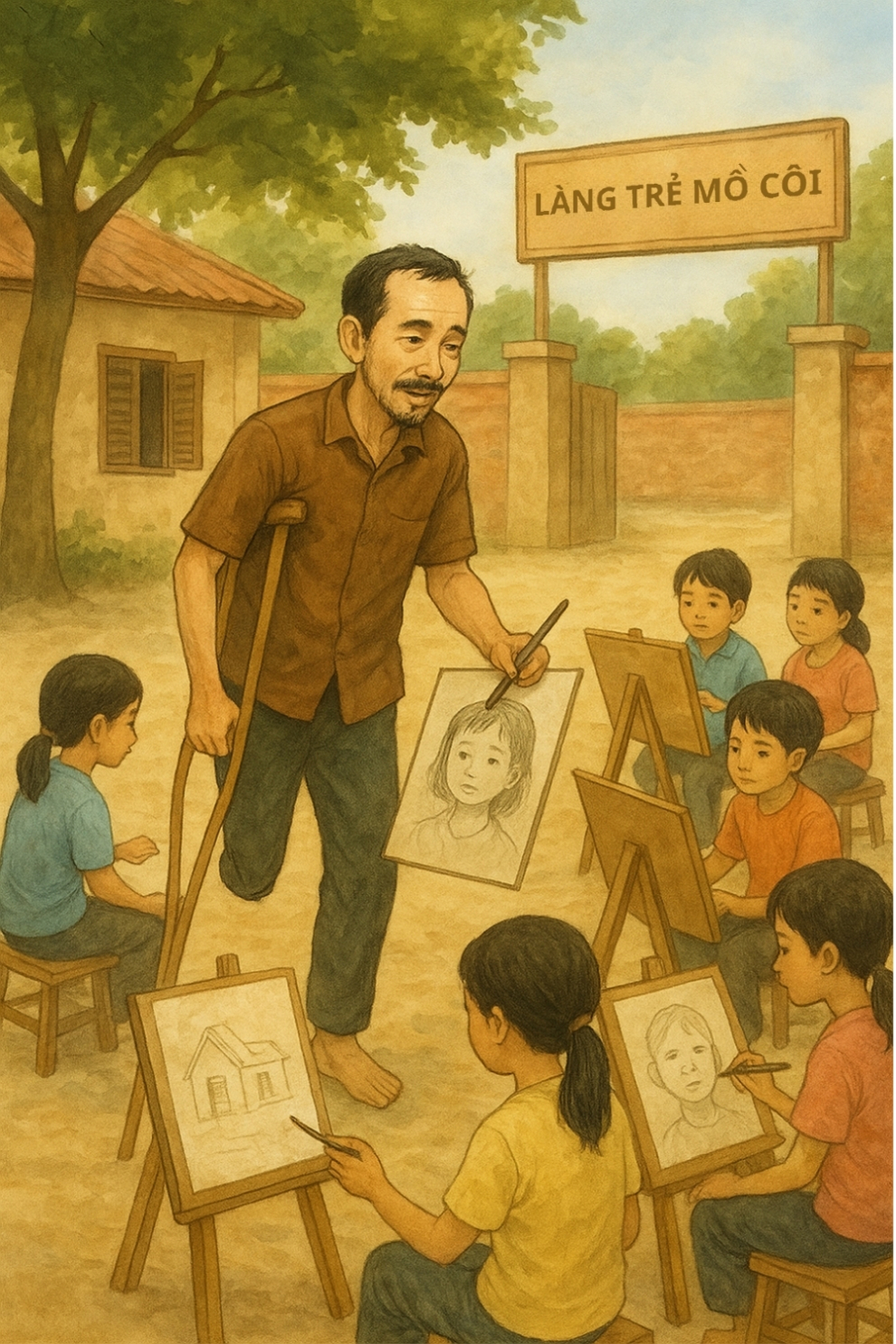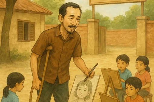 Thời gian lặng lẽ trôi. Anh vẽ tranh, bán online, nhận vẽ chân dung theo yêu cầu. Không nhiều tiền nhưng đủ để nuôi con. Anh còn dạy con học, kể chuyện cổ tích, tập đọc, tập viết. Những đêm An sốt cao, gọi mẹ trong giấc mơ, anh thức trắng đắp khăn mát, đôi chân đau nhức nhưng vẫn kiên trì bế con, dỗ dành con ngủ. An lớn dần lên trong tình yêu thương của anh. An học giỏi môn sử, hay kể cho anh nghe những câu chuyện về các nhân vật lịch sử, về lòng yêu nước, về những người cha thời loạn vẫn giữ đạo làm người. Năm An thi đậu trường THPT chuyên của tỉnh, lớp sử, anh mừng khôn xiết. Hai cha con ôm nhau giữa căn nhà bé xíu. Đêm đó, Bình ngồi một mình dưới hiên, gió se lùa vào tóc muối tiêu bồng bềnh. Anh vẽ lại bức tranh cũ của mình về người cha đứng dưới bóng cây, đứa trẻ dang tay ôm lấy ánh sáng. Lần đầu tiên sau bao nhiêu năm, anh thấy bàn tay trái của mình run lên không phải vì bệnh mà vì xúc động.