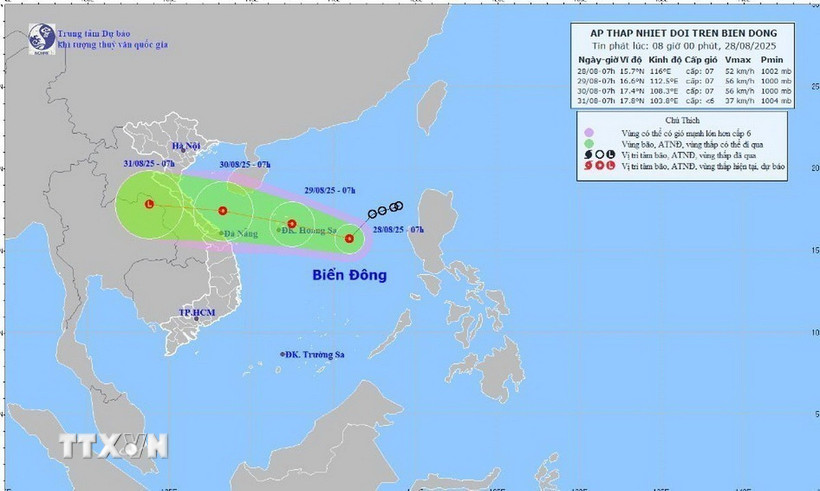 Đến 7 giờ ngày 29/8, áp thấp nhiệt đới trên khu vực biển đặc khu Hoàng Sa với sức gió mạnh cấp 7, giật cấp 9; di chuyển theo hướng Tây Tây Bắc với tốc độ 15-20 km/h và có khả năng mạnh thêm.