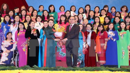 Ông Nguyễn Thiện Nhân, Ủy viên Bộ Chính trị, Chủ tịch Ủy ban Trung ương Mặt trận Tổ quốc Việt Nam tặng hoa chúc mừng Ban Chấp hành Trung ương Hội Liên hiệp Phụ nữ Việt Nam khóa XII, nhiệm kỳ 2017-2022. (Ảnh: TTXVN)