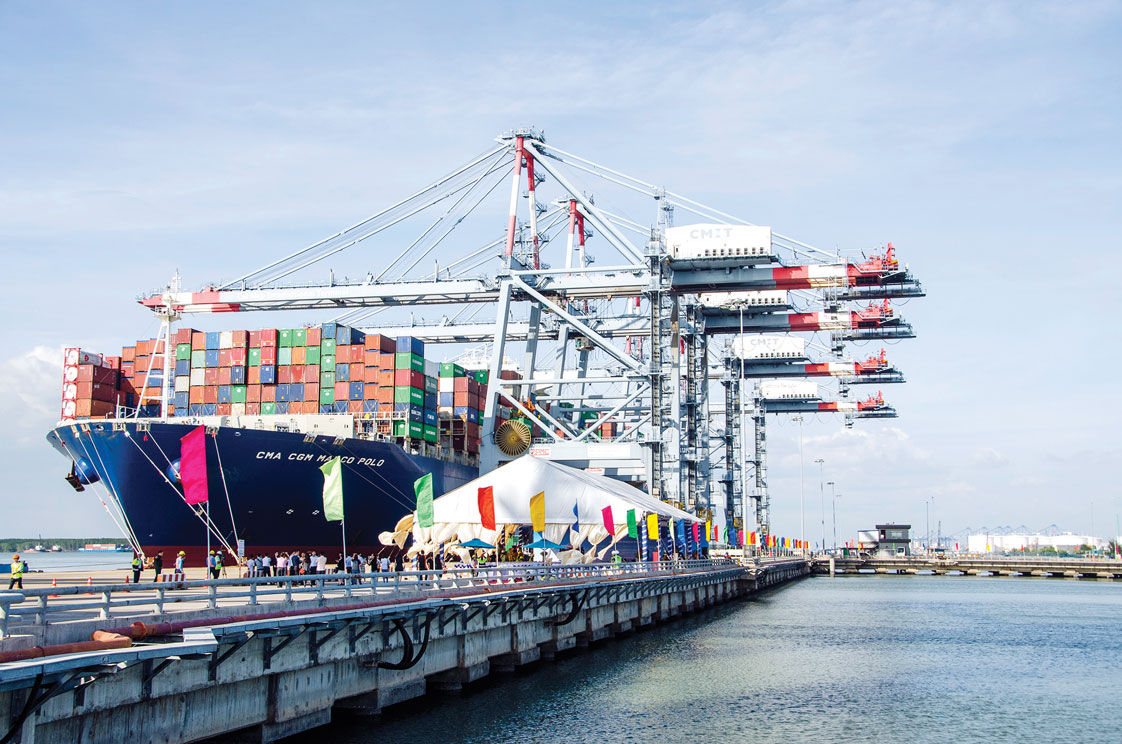 Ngày càng nhiều hãng tàu trọng tải lớn cập cảng Cái Mép - Thị Vải (Bà Rịa - Vũng Tàu) (Trong ảnh: Các đồng chí Nguyễn Hồng Lĩnh - Bí thư Tỉnh ủy và Nguyễn Văn Trình - Chủ tịch UBND tỉnh Bà Rịa - Vũng Tàu, đón và tham quan tàu CMA CGM Marco Polo, trọng tải 187.000 tấn và sức chở lên đến 17.000 TEUs cập cảng CMIT). Ảnh: Mạnh Thắng