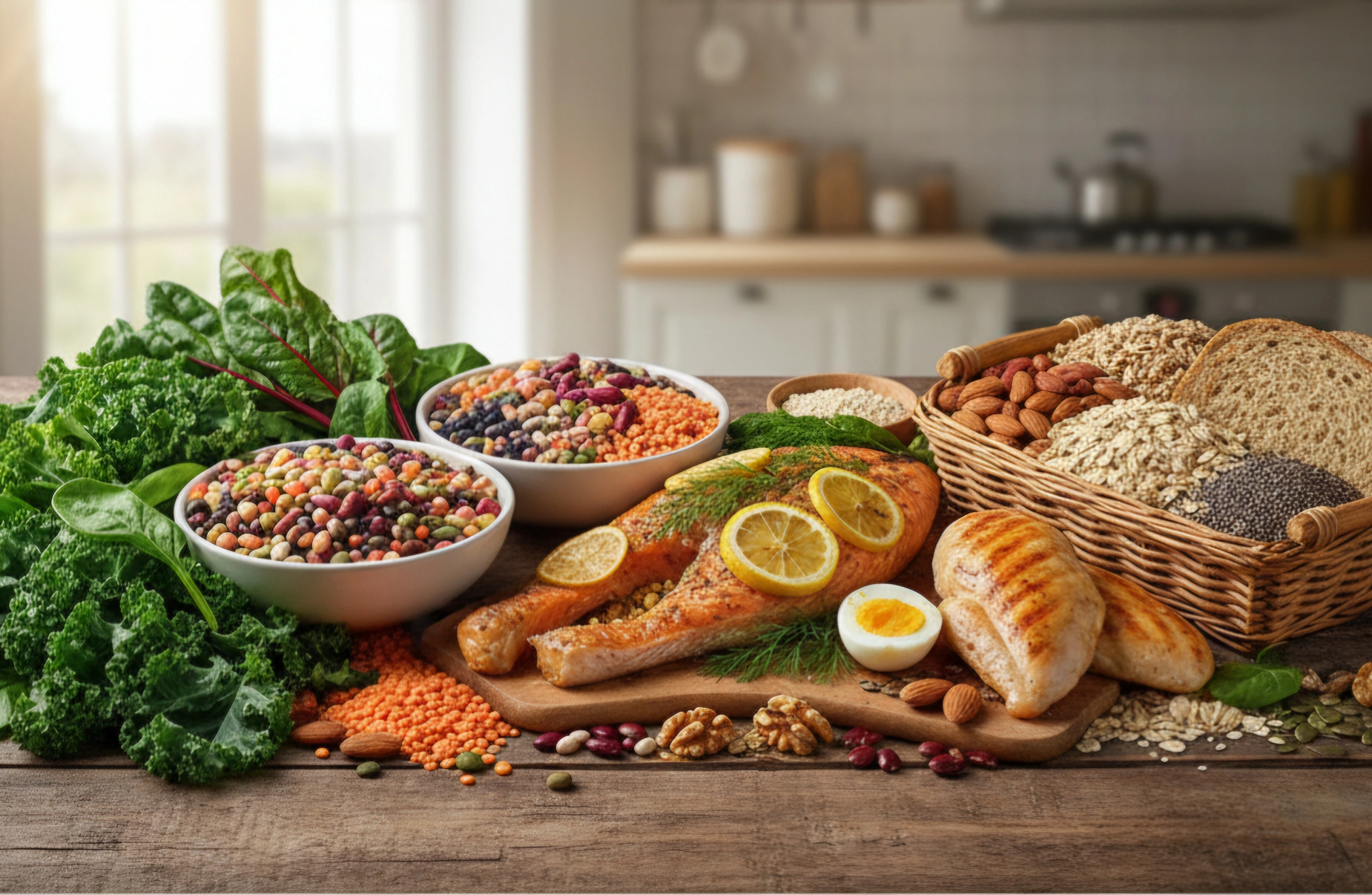 Ăn nhiều rau xanh, các loại đậu, cá, ngũ cốc nguyên hạt, protein để hạn chế nguy cơ gan nhiễm mỡ. ẢNH: AI