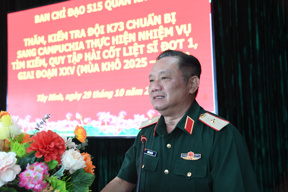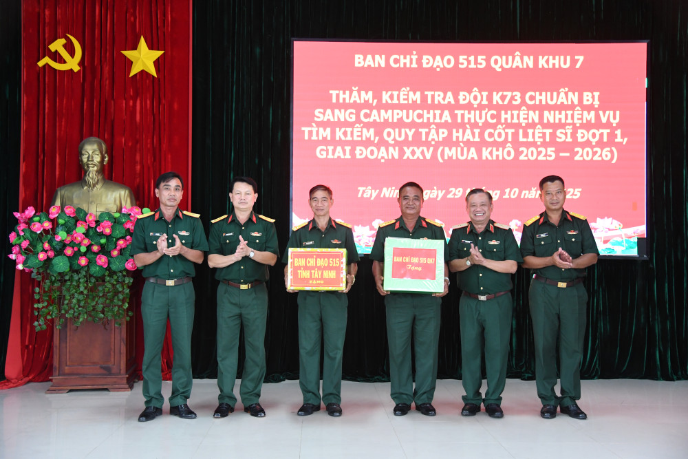 Ngày 29/10, Đoàn công tác Ban chỉ đạo 515 Quân khu 7 do Thiếu tướng Trần Chí Tâm - Phó Chính ủy, Trưởng Ban chỉ đạo 515 Quân khu làm Trưởng đoàn đến thăm, kiểm tra công tác chuẩn bị của Đội K73, Bộ CHQS tỉnh Tây Ninh trước khi lên đường thực hiện nhiệm vụ tìm kiếm, quy tập hài cốt liệt sĩ đợt 1, giai đoạn XXV (mùa khô 2025-2026).