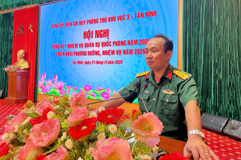 Sáng 21/11, Ban Chỉ huy Phòng thủ khu vực 3 – Tân Ninh, Bộ Chỉ huy Quân sự (CHQS) tỉnh Tây Ninh tổ chức Hội nghị tổng kết nhiệm vụ quân sự, quốc phòng năm 2025 và triển khai phương hướng, nhiệm vụ năm 2026. Thượng tá Ngô Khánh - Phó Chính ủy Bộ CHQS tỉnh, dự và chỉ đạo hội nghị.
