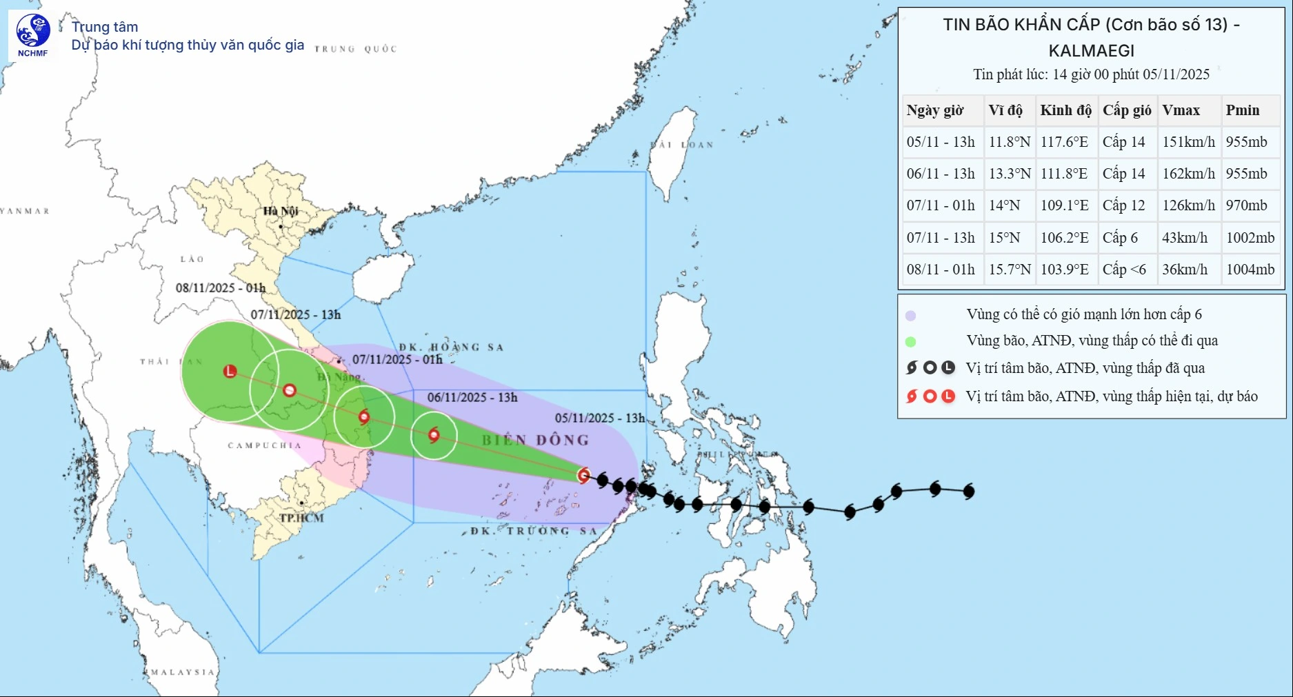 Trên Biển Đông, bão Kalmaegi (số 13) đang mạnh lên và có thể đạt cấp 14 giật cấp 17 vào ngày mai. Bão số 13 di chuyển nhanh về hướng đất liền ảnh hưởng trực tiếp các tỉnh từ Quảng Ngãi đến Đắk Lắk.