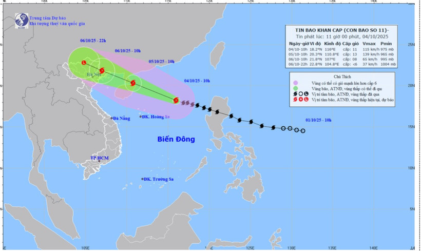 Lúc 11 giờ ngày 4/10, vị trí tâm bão số 11 ở khoảng 18,2 độ vĩ bắc, 115,7 độ kinh đông, cách đặc khu Hoàng Sa khoảng 390km về phía đông đông bắc.