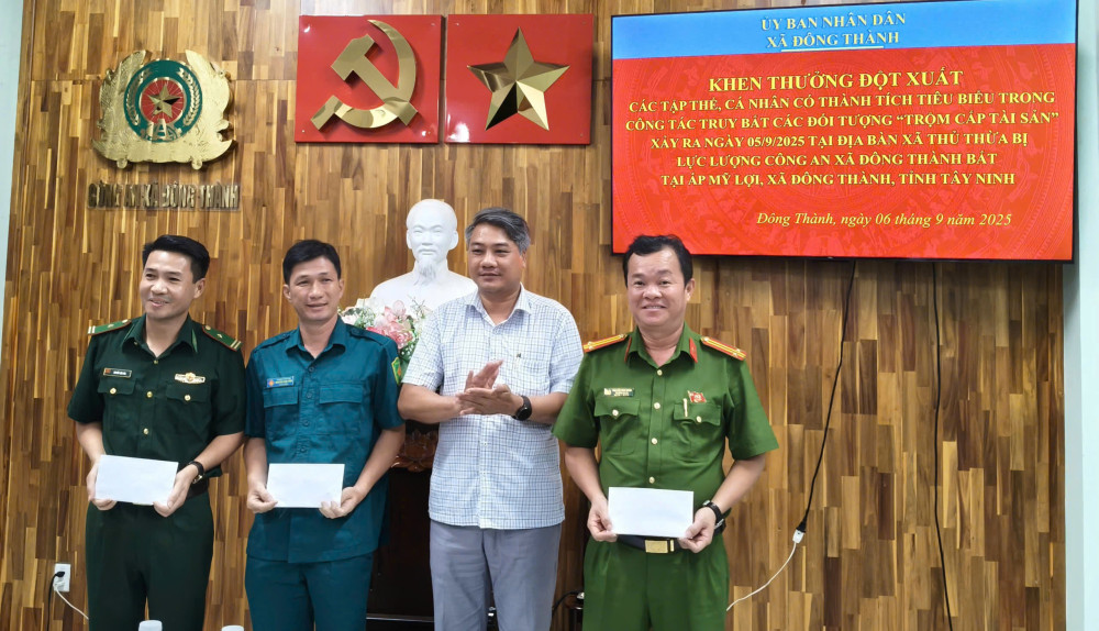 Ngày 08/9, Công an xã Đông Thành, tỉnh Tây Ninh cho biết đã bàn giao 2 đối tượng Hồ Hồng Vũ (32 tuổi) và Trần Bảo (23 tuổi) cùng ngụ phường Long An cho Công an xã Thủ Thừa để điều tra về hành vi trộm cắp tài sản.