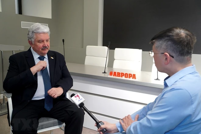 Chủ tịch Đảng Liên minh Toàn dân Nga Sergey Baburin trả lời phỏng vấn phóng viên TTXVN tại Liên bang Nga. (Nguồn: TTXVN)