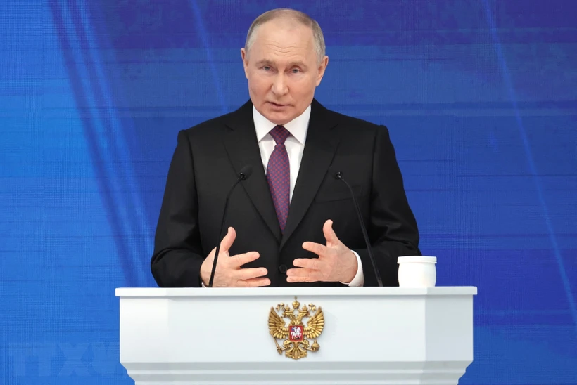 Tổng thống Nga Vladimir Putin phát biểu tại Moskva ngày 29/2/2024. (Ảnh: AFP/TTXVN)
