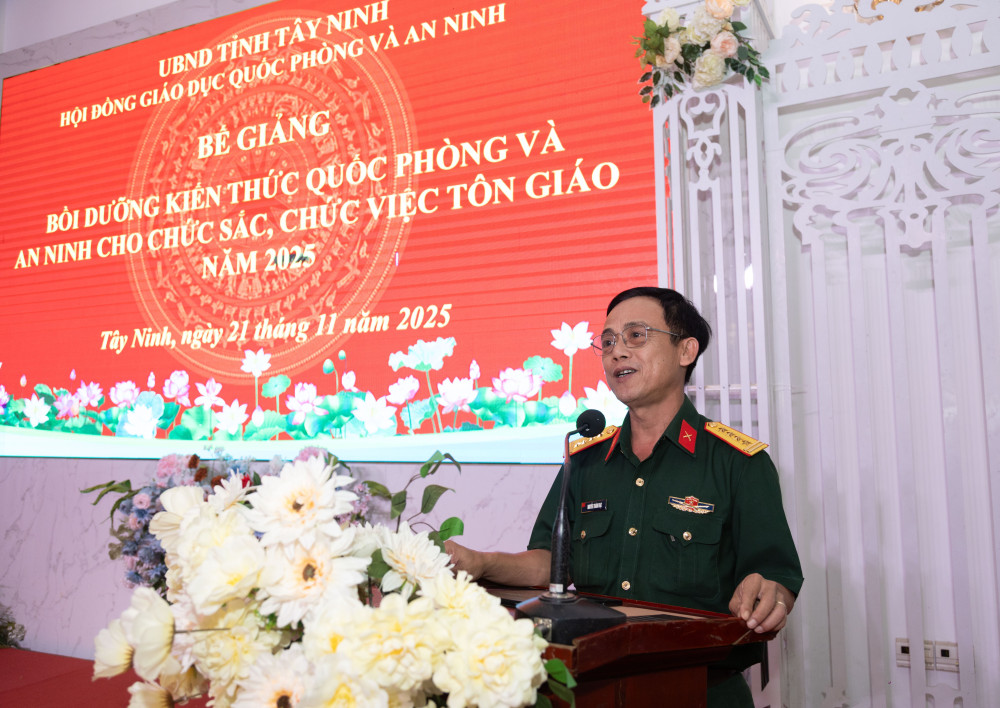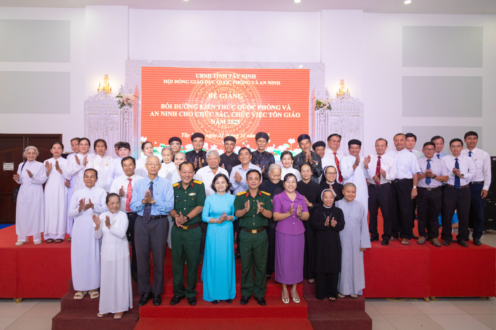 Chiều 21/11, tại phường Long An, tỉnh Tây Ninh, Hội đồng Giáo dục quốc phòng và an ninh (QP-AN) tỉnh Tây Ninh tổ chức bế mạc lớp bồi dưỡng kiến thức QP-AN dành cho chức sắc, chức việc tôn giáo trên địa bàn tỉnh.