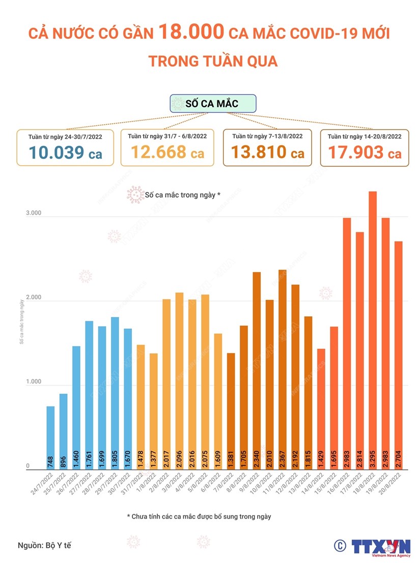 Trong tuần từ ngày 14-20/8, cả nước ghi nhận gần 18.000 ca mắc COVID-19 mới, trung bình hơn 2.000 ca mắc mới mỗi ngày.