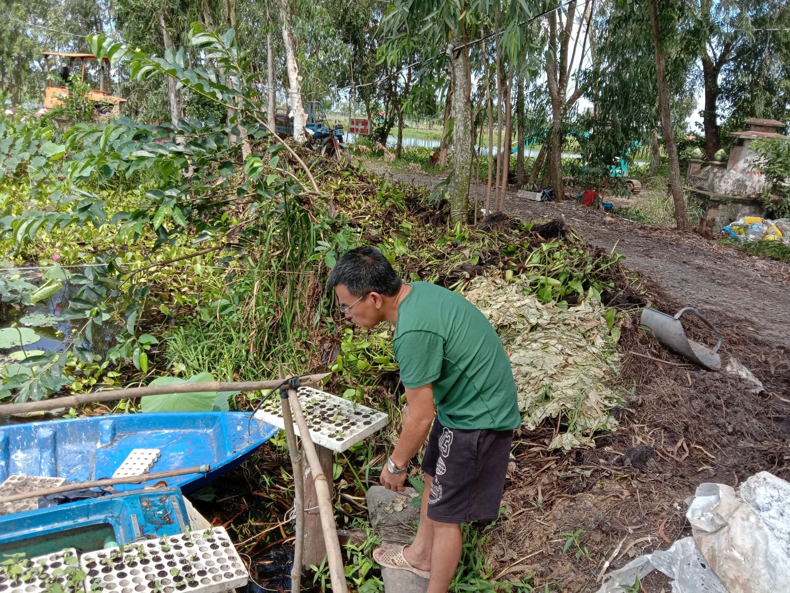 Chủ trang trại - Nguyễn Văn Đắc kiểm tra bè ươm giống ngò rí