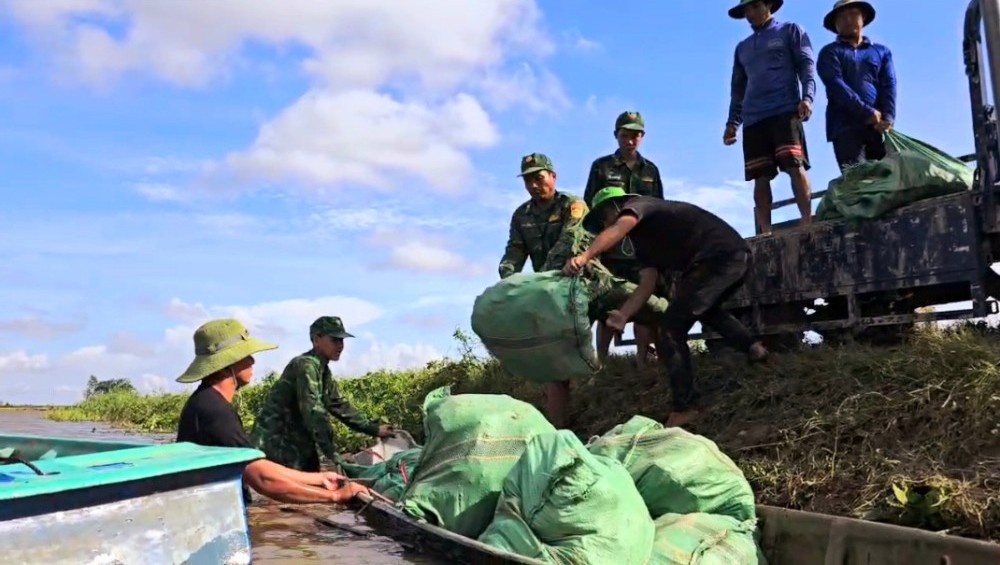 Ngày 27/10, trước diễn biến bất thường của thời tiết, Đồn Biên phòng Sông Trăng (tỉnh Tây Ninh) huy động lực lượng phối hợp chính quyền và Nhân dân xã Hưng Điền khẩn trương gia cố các tuyến đê bao thấp, yếu, bị sạt lở, thấm nước, nhằm bảo vệ diện tích lúa sắp thu hoạch của người dân địa phương.