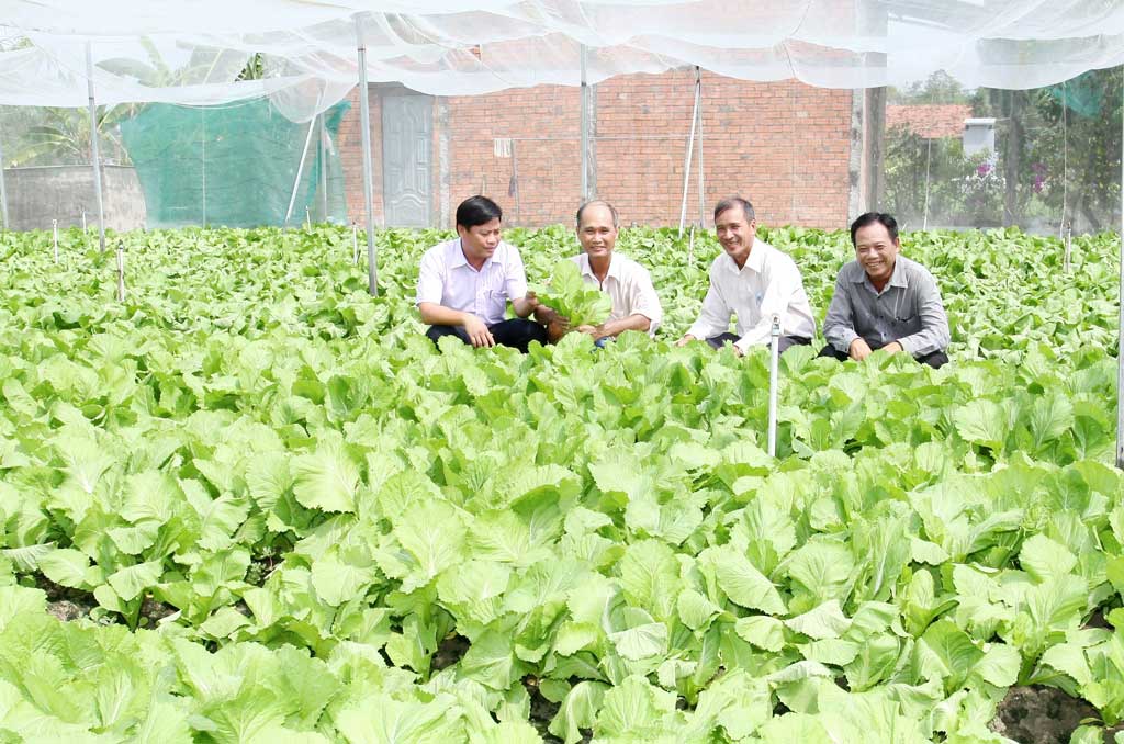 Chủ tịch UBND huyện Cần Đước Huỳnh Văn Quang Hùng (bên trái) khảo sát tình hình ứng dụng công nghệ cao trồng rau màu