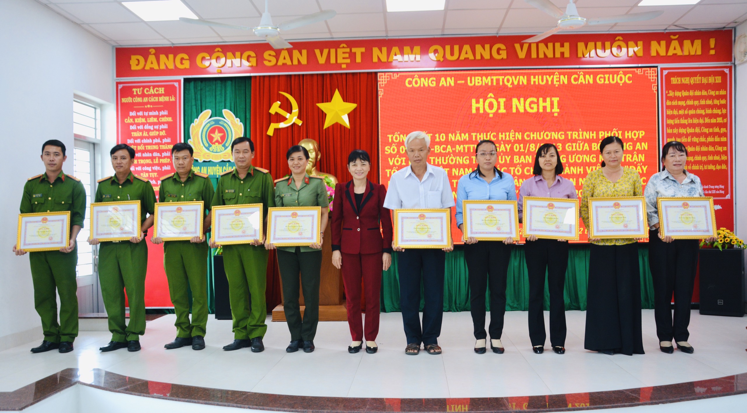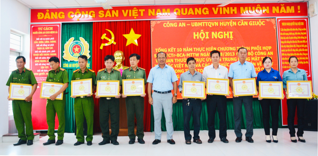 Ngày 12/5, huyện Cần Giuộc, tỉnh Long An tổ chức tổng kết 10 năm thực hiện Chương trình phối hợp số 09 ngày 01/8/2013 giữa Bộ Công an với Ban Thường trực Ủy ban Trung ương MTTQ Việt Nam và các tổ chức thành viên về “Đẩy mạnh phong trào Toàn dân bảo vệ an ninh Tổ quốc trong tình hình mới” giai đoạn 2013 - 2023.