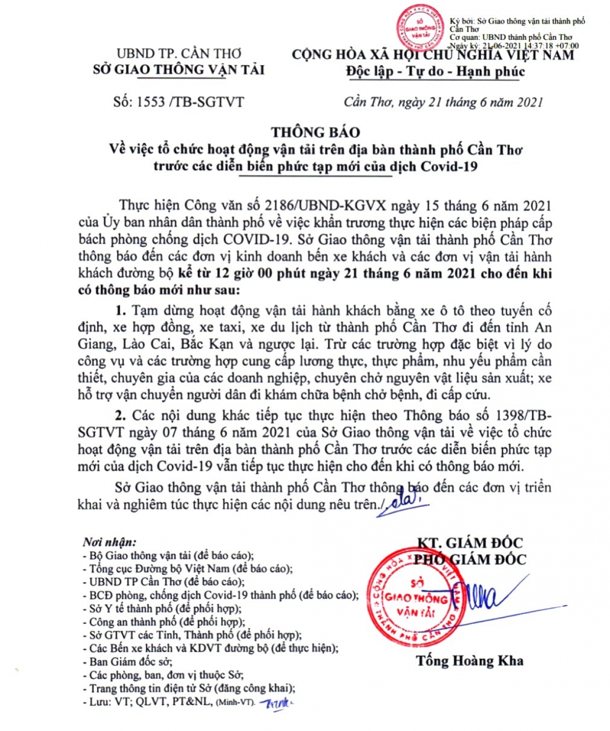 Hôm nay (21/6), Cần Thơ tạm dừng hoạt động vận tải hành khách từ thành phố Cần Thơ đến các tỉnh An Giang, Lào Cai, Bắc Kạn và ngược lại.