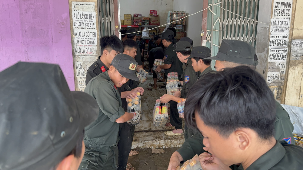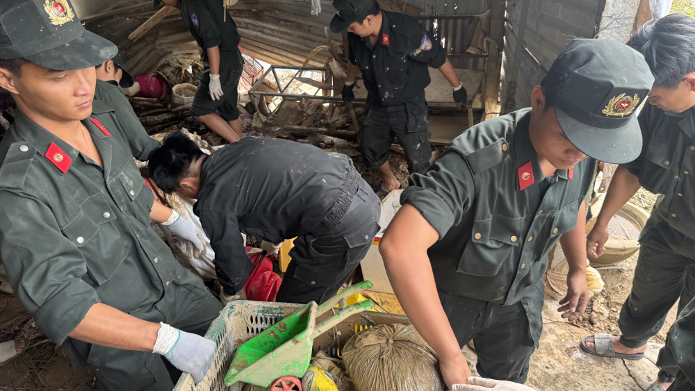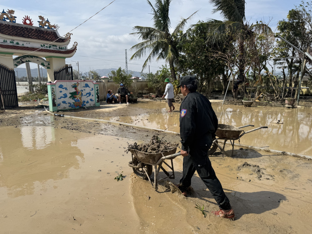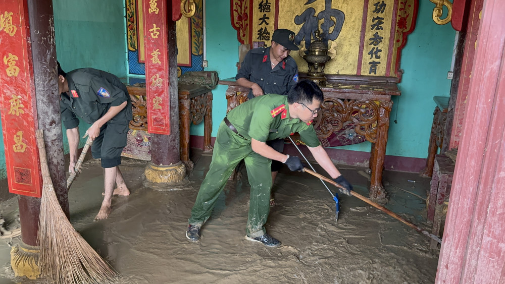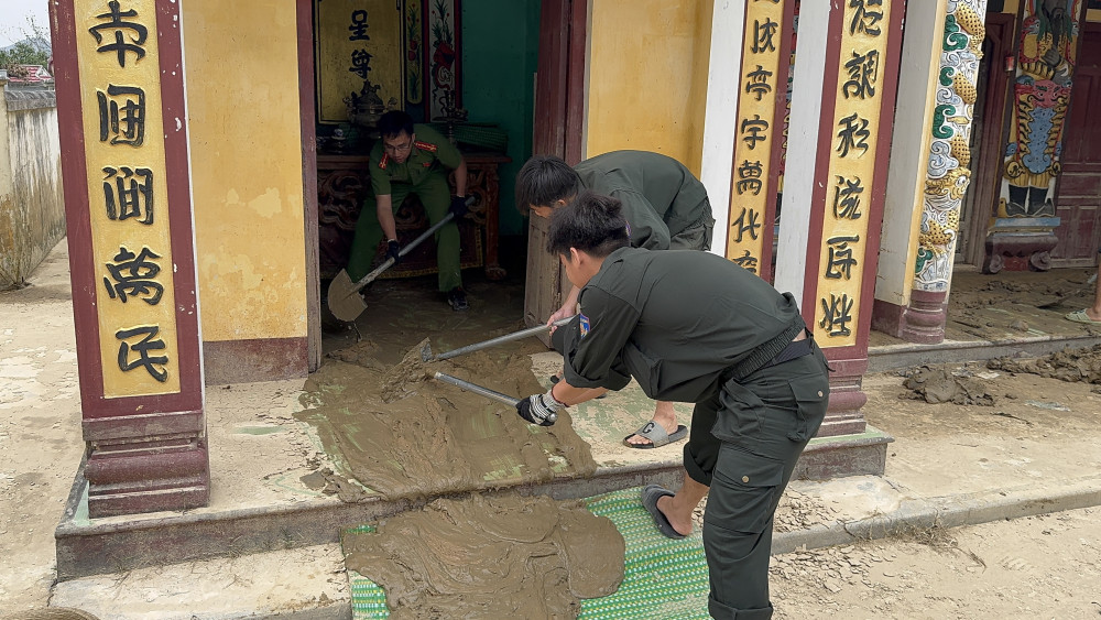 Cán bộ, chiến sĩ hỗ trợ dọn dẹp bùn lầy tại một cơ sở tôn giáo trên địa bàn