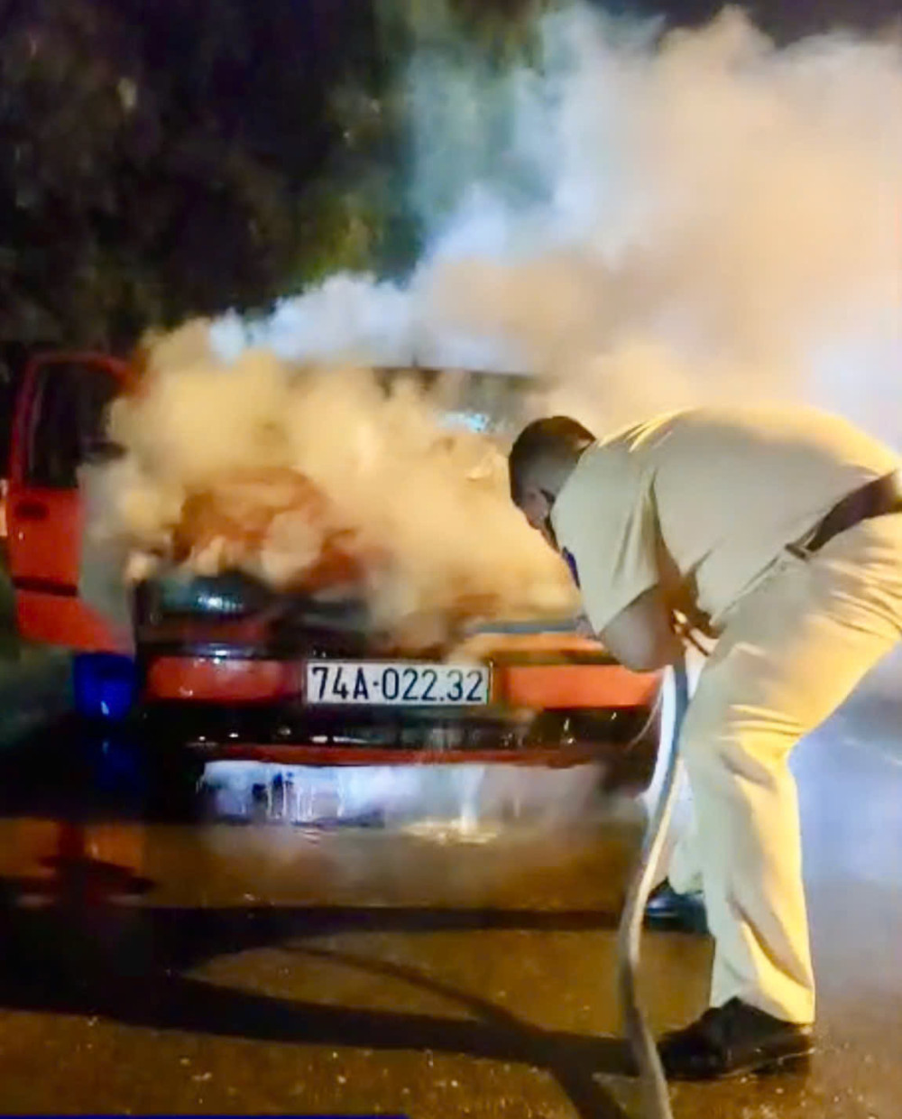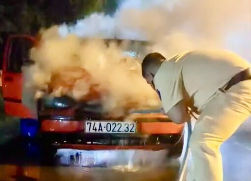 Phát hiện chiếc ô tô bốc cháy bên đường, cán bộ, chiến sĩ Trạm Cảnh sát giao thông (CSGT) Trảng Bàng, Phòng CSGT Công an Tây Ninh nhanh chóng tiếp cận, cứu 2 người bị mắc kẹt trong xe và nỗ lực cùng người dân dập lửa.