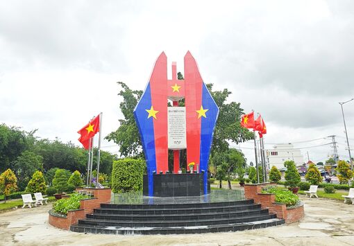 Bia chiến công Trung đoàn Bộ binh 174 trong công viên nhỏ bên Quốc lộ 1