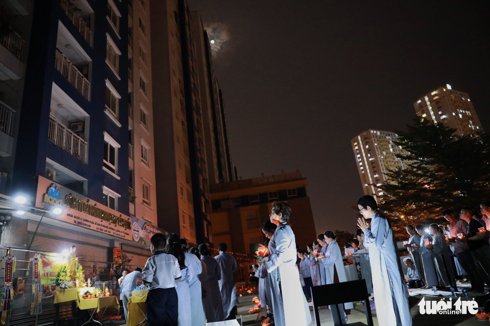 Đến với buổi cầu siêu tối nay còn có người dân từ Q.5, Q.6, Bình Tân (TP.HCM)..., dù không có người thân mình sống ở chung cư này. Ngoài ra, đoàn tăng ni Phật tử đến từ tỉnh Bến Tre cũng tham gia cầu siêu với những hoa đăng trên tay.
