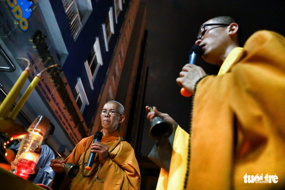 Hai sư thầy đến từ tỉnh Bến Tre tham gia làm lễ cầu siêu - Ảnh: HỮU KHOA