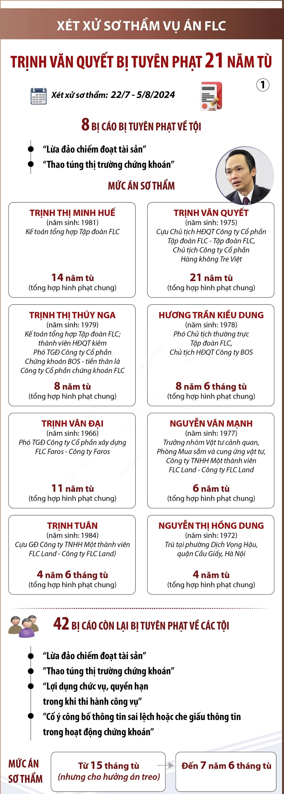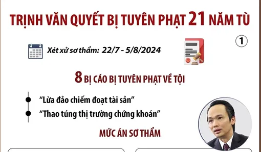 Bị cáo Trịnh Văn Quyết bị Tòa tuyên 18 năm tù về tội “Lừa đảo chiếm đoạt tài sản”, 3 năm tù về tội “Thao túng thị trường chứng khoán," tổng hợp hình phạt chung đối với bị cáo Quyết là 21 năm tù.