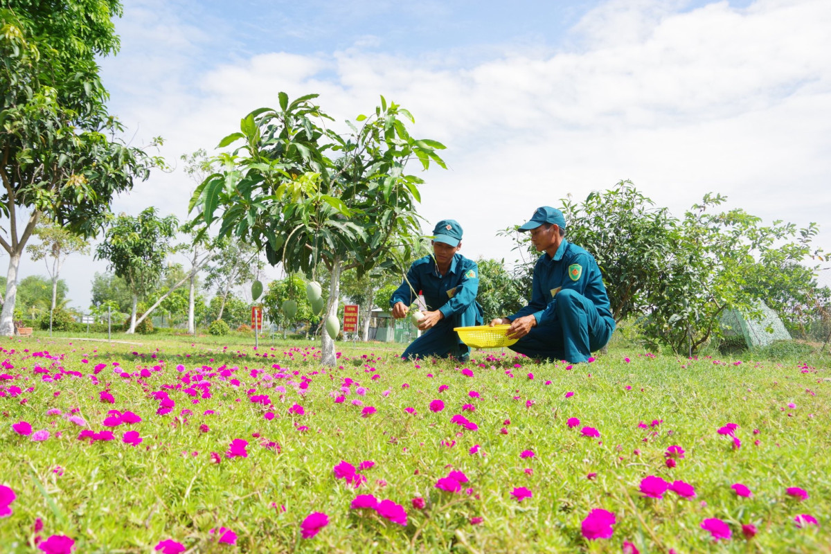 Cán bộ, chiến sĩ Chốt dân quân Tân Hiệp (xã Tân Hiệp, huyện Thạnh Hóa) xây dựng cảnh quan môi trường xanh, sạch, đẹp