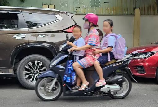Đại diện Phòng CSGT (PC08) Công an TP.HCM cho biết, việc để trẻ em - đặc biệt là trẻ từ 6 tuổi trở lên ngồi phía trước xe máy tiềm ẩn rất nhiều nguy hiểm. Khi ngồi trước, trẻ dễ bị mất thăng bằng, bị gió bụi tác động, tay chân có thể va chạm vào tay lái, gây ảnh hưởng trực tiếp đến khả năng điều khiển phương tiện của người lái. Đây là một trong các nguyên nhân phổ biến dẫn đến tai nạn tự ngã hoặc va chạm.