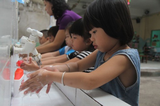 Hướng dẫn trẻ cách rửa tay bằng xà phòng để phòng, chống dịch bệnh. Ảnh: Ngọc Thạch