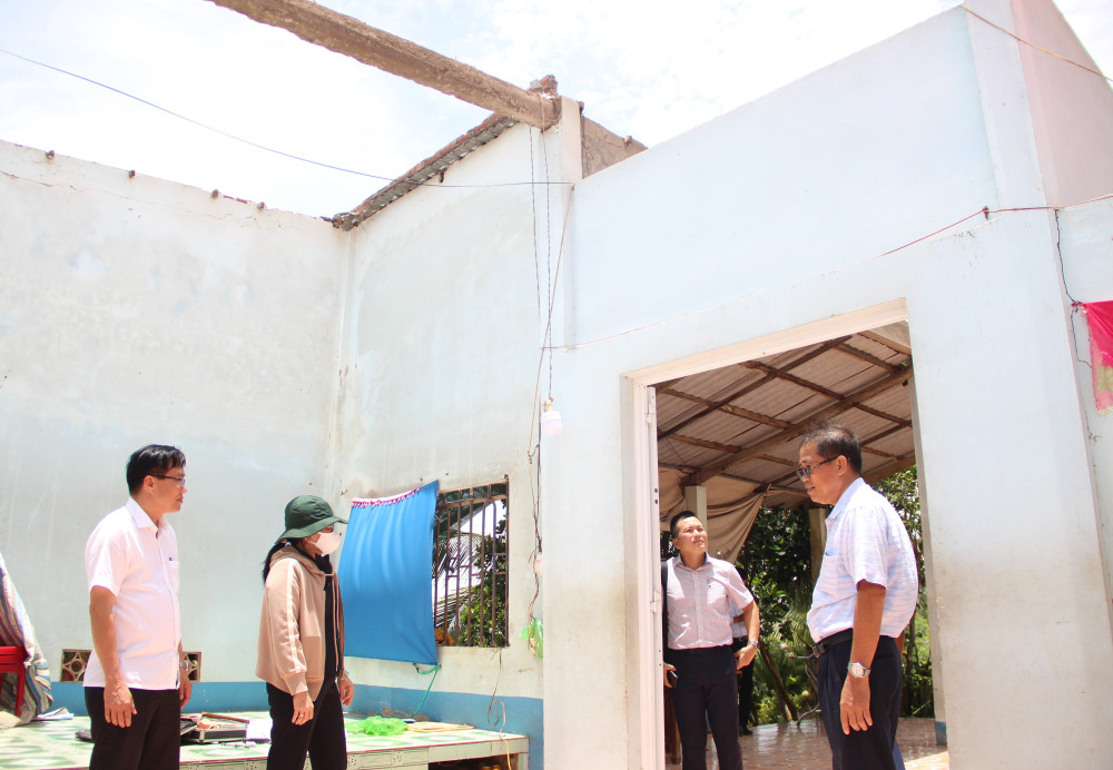 Phó Giám đốc Sở Nông nghiệp và Môi trường Đinh Thị Phương Khanh khảo sát nhà dân bị tốc mái do giông, lốc tại xã Vĩnh Châu