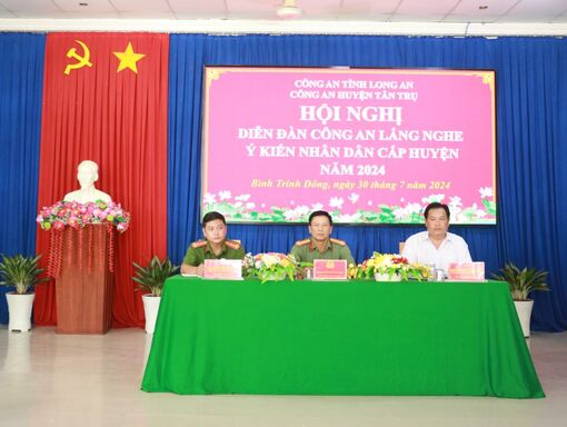 Chiều 30/7, tại xã Bình Trinh Đông, Công an huyện Tân Trụ, tỉnh Long An tổ chức Diễn đàn lắng nghe ý kiến nhân dân cấp huyện năm 2024. Đại diện lãnh đạo huyện, công an và người dân trên địa bàn huyện tham dự.