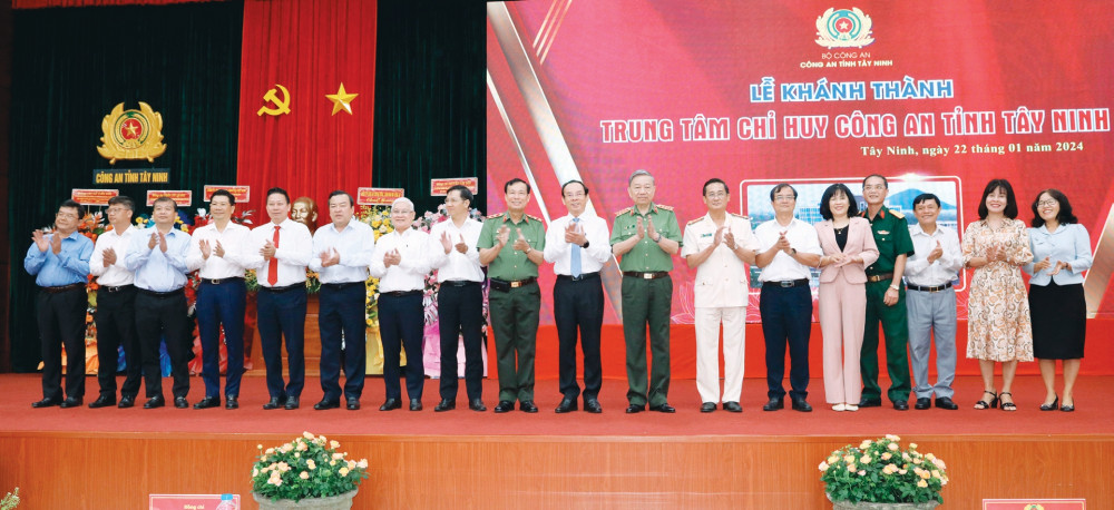 Đại tướng Tô Lâm - Ủy viên Bộ Chính trị, Bí thư Đảng ủy Công an Trung ương, Bộ trưởng Bộ Công an (nay là Tổng Bí thư Ban Chấp hành Trung ương Đảng Cộng sản Việt Nam); Bí thư Thành ủy TP.Hồ Chí Minh Nguyễn Văn Nên; Chủ nhiệm Ủy ban Quốc phòng và An ninh của Quốc hội Lê Tấn Tới; Bí thư Tỉnh ủy Bình Dương Nguyễn Văn Lợi; Bí thư Tỉnh ủy Tây Ninh Nguyễn Thành Tâm; đồng chí Giám đốc Công an tỉnh Tây Ninh cùng đại diện các sở, ban, ngành chụp ảnh lưu niệm tại buổi Lễ khánh thành Trung tâm Chỉ huy Công an tỉnh Tây Ninh ngày 22/01/2024