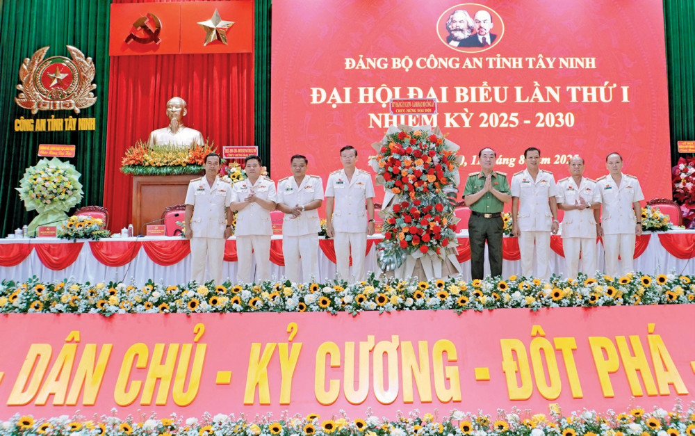 Thượng tướng Trần Quốc Tỏ - Ủy viên Ban Chấp hành Trung ương Đảng, Phó Bí thư Đảng ủy Công an Trung ương, Thứ trưởng Bộ Công an, tặng hoa chúc mừng Đại hội Đại biểu Đảng bộ Công an tỉnh Tây Ninh lần thứ I, nhiệm kỳ 2025-2030