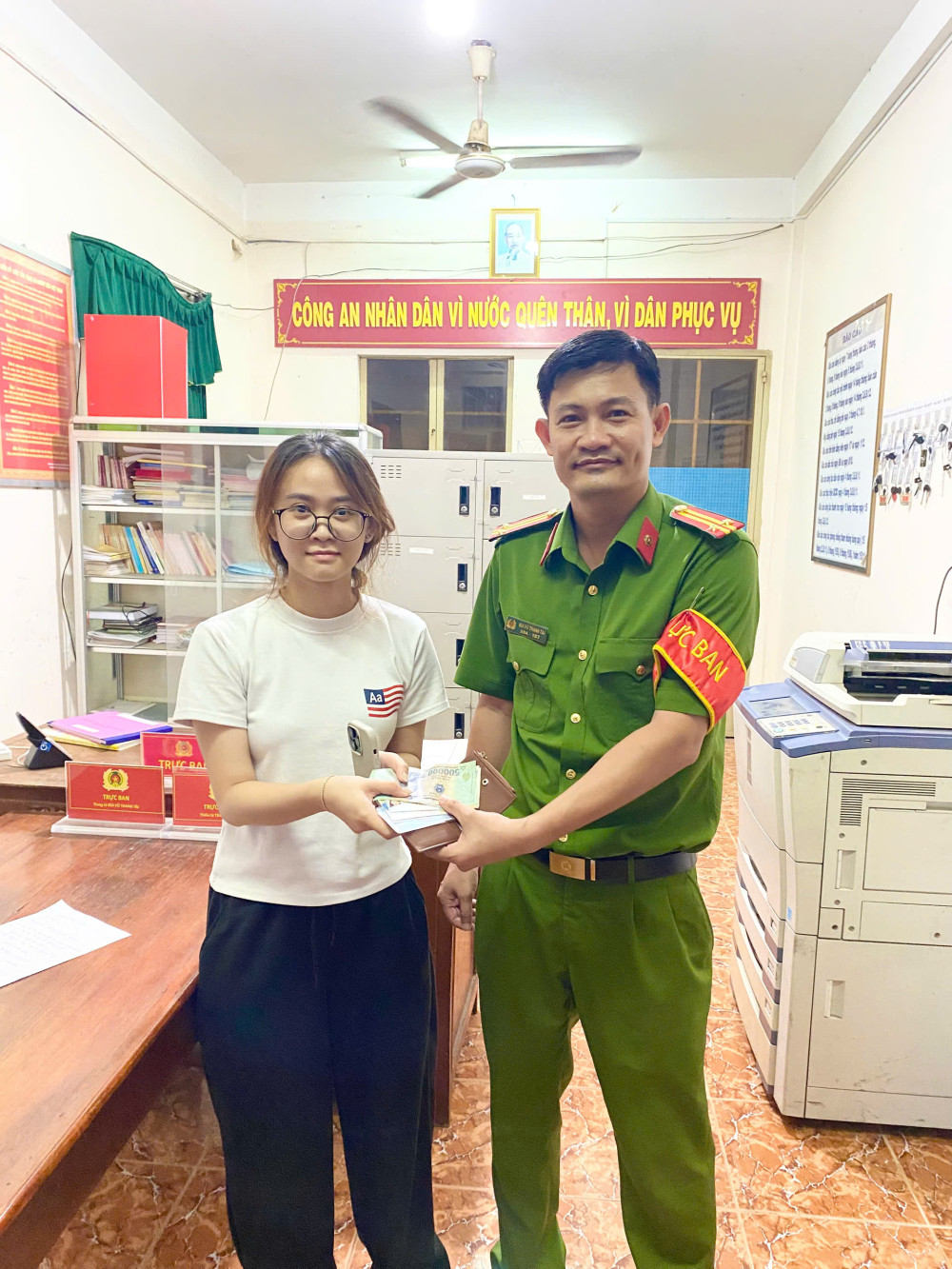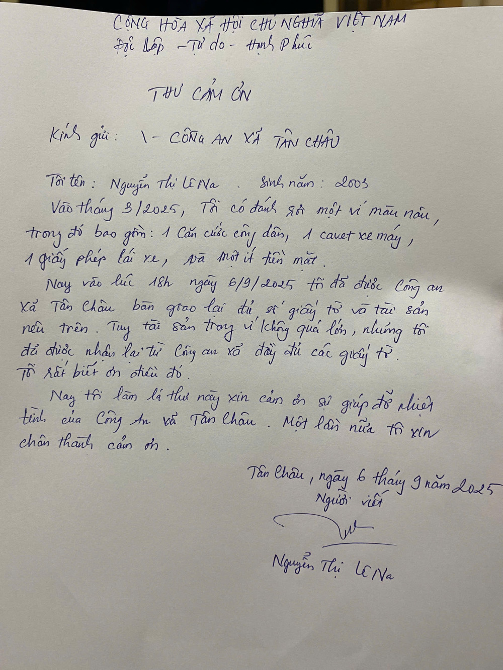 Vào lúc 16 giờ, ngày 06/9, Trực ban Công an xã Tân Châu tiếp nhận bàn giao giấy tờ và tài sản bị đánh rơi của chị Nguyễn Thị Lê Na (sinh năm 2003, ngụ ấp 3, xã Tân Châu, tỉnh Tây Ninh) từ Công an phường Tân Ninh, tỉnh Tây Ninh gồm: 1 căn cước công dân, 1 giấy phép lái xe, 1 chứng nhận đăng ký xe và số tiền mặt hơn 2 triệu đồng.