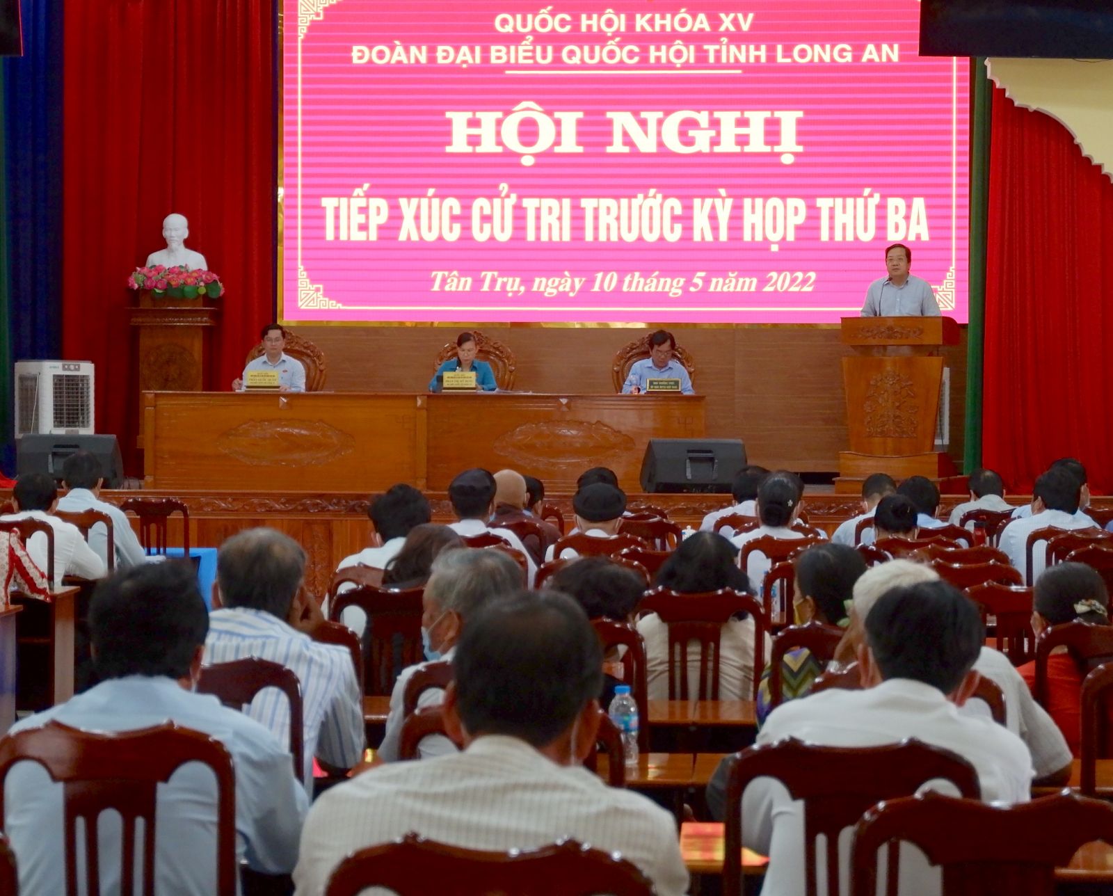 Chiều 10/5, Đoàn Đại biểu Quốc hội tỉnh Long An gồm Giám đốc Sở Tư pháp tỉnh – Phan Thị Mỹ Dung; Phó Chủ tịch Hội Nông dân tỉnh – Trần Quốc Quân có cuộc tiếp xúc cử tri các xã Bình Tịnh, Đức Tân, Tân Phước Tây, Bình Trinh Đông, Bình Lãng và thị trấn Tân Trụ, huyện Tân Trụ trước Kỳ họp thứ 3, Quốc hội Khóa XV. Phó Chủ tịch UBND tỉnh - Nguyễn Minh Lâm, đại diện lãnh đạo sở, ngành tỉnh cùng dự tiếp xúc cử tri.