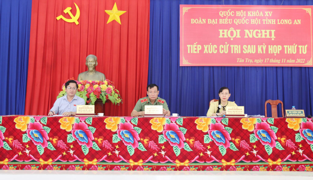 Sáng 17/11, Đoàn đại biểu Quốc hội (ĐBQH) tỉnh Long An gồm ông Lê Tấn Tới - Ủy viên Ban Chấp hành Trung ương Đảng, Ủy viên Ủy ban Thường vụ Quốc hội, Chủ nhiệm Ủy ban Quốc phòng và An ninh của Quốc hội; bà Phan Thị Mỹ Dung - Giám đốc Sở Tư pháp; ông Trần Quốc Quân - Phó Chủ tịch Hội Nông dân tỉnh, có cuộc tiếp xúc cử tri 2 xã Lạc Tấn và Quê Mỹ Thạnh, huyện Tân Trụ sau Kỳ họp thứ tư, Quốc hội khóa XV.