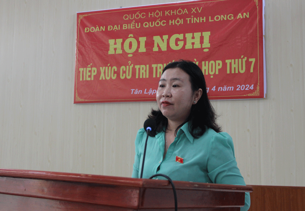 Sáng 25/4, Đoàn đại biểu Quốc hội (ĐBQH) tỉnh Long An có cuộc tiếp xúc cử tri tại xã Tân Lập, huyện Tân Thạnh trước Kỳ họp thứ 7, Quốc hội khóa XV. Dự buổi tiếp xúc có Phó Trưởng đoàn chuyên trách Đoàn ĐBQH tỉnh - Lê Thị Song An; đại diện các sở, ngành tỉnh và lãnh đạo địa phương.