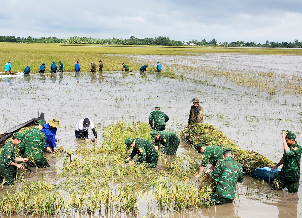 Cán bộ, chiến sĩ Bộ đội Biên phòng giúp Nhân dân thu hoạch lúa trong mùa lũ