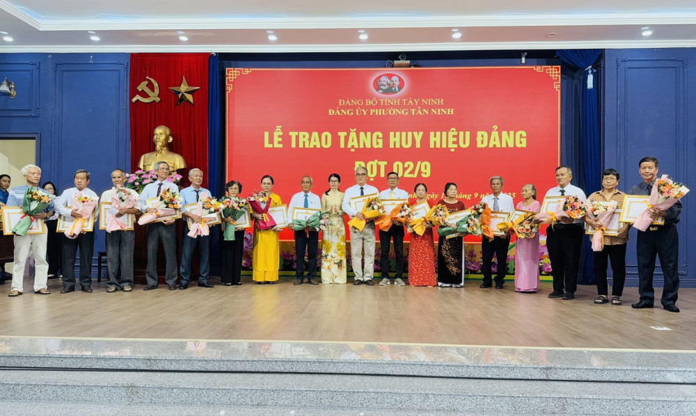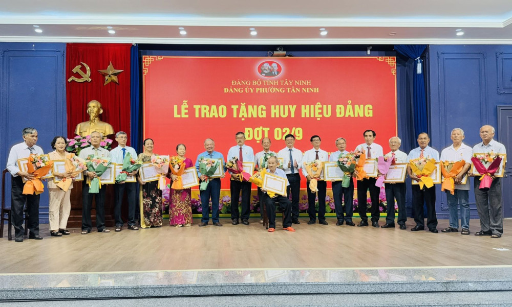 Chiều 15/9, Đảng ủy phường Tân Ninh, tỉnh Tây Ninh tổ chức Lễ trao tặng Huy hiệu 60 năm, 55 năm, 50 năm, 45 năm, 40 năm và 30 năm tuổi Đảng đợt 02/9 cho 52 đảng viên đang sinh hoạt tại các chi bộ trực thuộc Đảng bộ phường Tân Ninh.