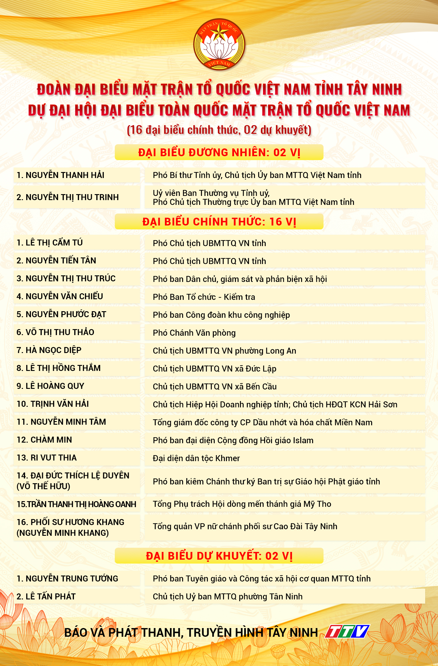 Tại phiên làm việc thứ nhất Đại hội đại biểu MTTQ Việt Nam tỉnh Tây Ninh khóa, nhiệm kỳ 2025 - 2030, diễn ra ngày 17/11/2025, các đại biểu hiệp thương dân chủ cử Đoàn đại biểu dự Đại hội đại biểu MTTQ Việt Nam gồm 16 đại biểu chính thức và 2 đại biểu dự khuyết.