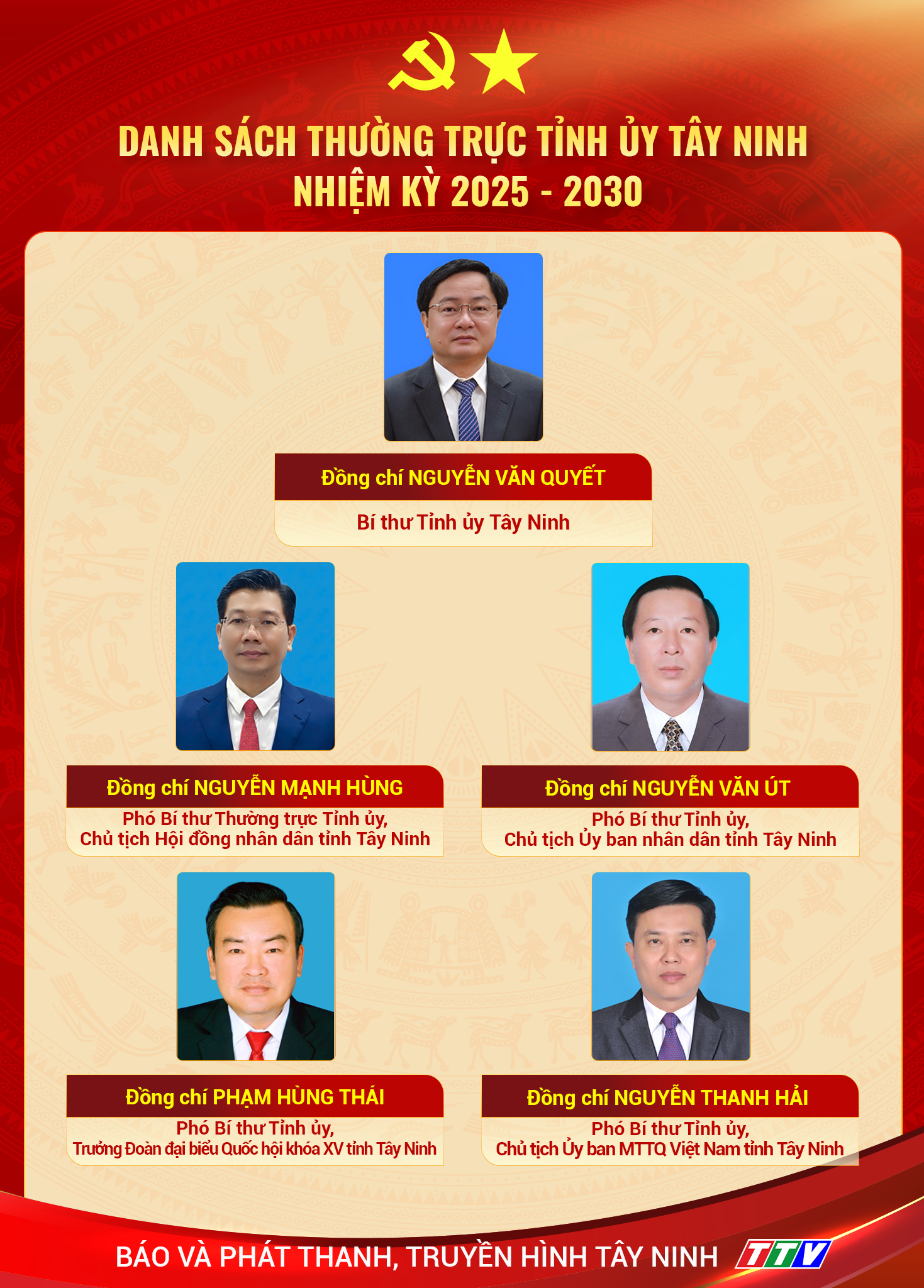 Phiên chính thức Đại hội đại biểu Đảng bộ tỉnh Tây Ninh lần thứ I, nhiệm kỳ 2025-2030 diễn ra ngày 10/10/2025, đã công bố Quyết định của Bộ Chính trị chỉ định tham gia Ban Chấp hành, Ban Thường vụ Tỉnh ủy, Ủy ban Kiểm tra Tỉnh ủy Tây Ninh nhiệm kỳ 2025-2030. Theo đó, Thường trực Tỉnh ủy Tây Ninh nhiệm kỳ 2025-2030 gồm 5 đồng chí.