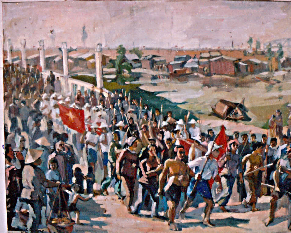 Tranh Những ngày tháng 8 năm 1945 do họa sĩ Hữu Phương vẽ bằng màu bột trên giấy