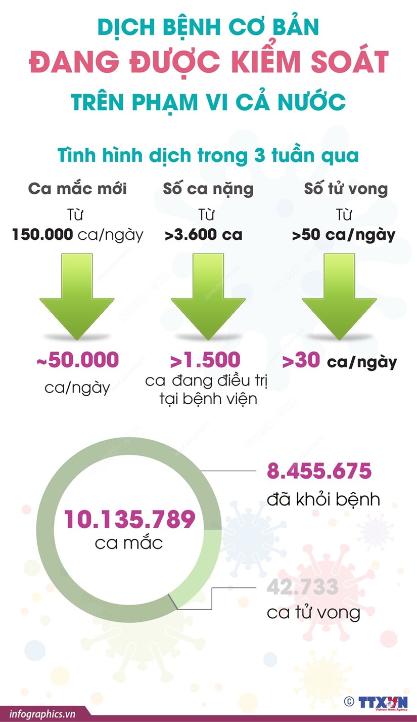 Trong 3 tuần qua, số ca nhiễm, ca nặng và tử vong tại các tỉnh, thành phố có xu hướng giảm từng ngày, trong đó: từ 150.000 ca mắc mới mỗi ngày xuống còn trên dưới 50.000 ca mỗi ngày, số ca nặng từ hơn 3.600 ca xuống còn hơn 1.500 ca đang điều trị tại bệnh viện, số tử vong từ hơn 50 ca mỗi ngày xuống còn hơn 30 ca mỗi ngày./.