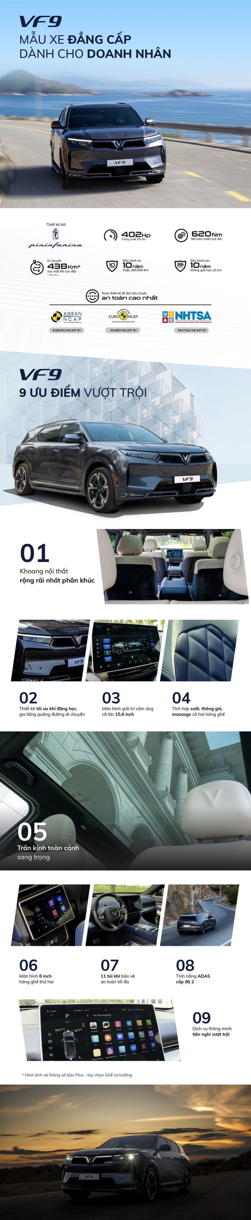 Sở hữu thiết kế sang trọng được chắp bút bởi studio Pininfarina danh tiếng, cùng loạt tiện nghi đẳng cấp hàng đầu phân khúc E-SUV, VinFast VF 9 như được “đo ni đóng giày” cho các doanh nhân và gia đình Việt tiên phong dẫn đầu xu hướng di chuyển xanh.