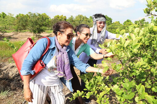 Các thành viên Hiệp hội Du lịch tỉnh khám phá vườn chanh vàng không hạt của ông Nguyễn Văn Hiển
