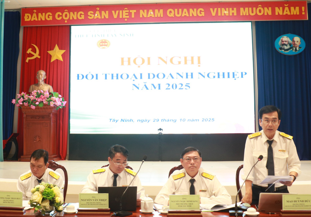 Ngày 29/10, Thuế tỉnh Tây Ninh tổ chức Hội nghị đối thoại, tháo gỡ khó khăn cho doanh nghiệp, người nộp thuế năm 2025. Lãnh đạo Thuế tỉnh Tây Ninh, 160 đại biểu đại diện cho doanh nghiệp, người nộp thuế trên địa bàn tham dự.